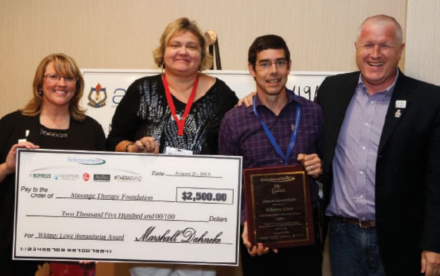 Whitney Lowe, L.M.T. was presented the 2015 Performance Health/Massage Therapy Foundation Humanitarian Award at this year’s American Massage Therapy Association National Convention in Pittsburgh, Pa. Performance Health annually partners with the Massage Therapy Foundation to present this award. Lowe was honored for his efforts in embracing the power of massage and the mission of the Massage Therapy Foundation, to promote education and research while serving others.